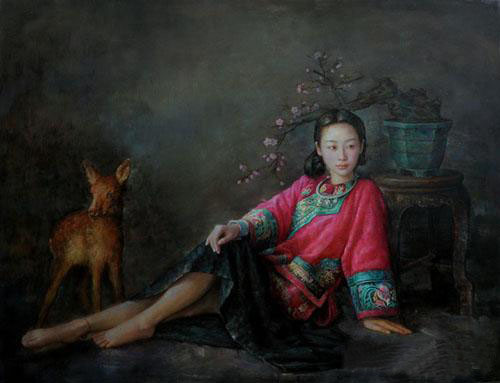 在他的绘画里程中,记录着自己每一个现实生活中流露出的诗意瞬间和感悟。不满足于现实生活中的具象形态,而在不断的诗化着画面中的每个小细节。他也擅长将人物安置在隐喻的场景里,远方的群山,玲珑的奇石,斑驳的石壁,镜中的倒影都是对画面诗意的当代追求。画家心中隐藏的儿时记忆,与在画面间的诗意流露,让你能慢慢的感受到艺术家对艺术的一份淡定与安然。