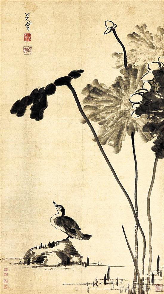 八大山人荷花水禽123cm×67cm 八大山人的书画早期曾受董其昌影响,他对董其昌的艺术造诣,相当推崇。他临摹的董其昌画册,至今还流传在世。而且,直到他的晚年,在书信之中寻索董其昌的书画,是常有的事情。董其昌的影响,可以产生“四王吴恽”,也可以产生八大山人。这就证明个人内心的感受所抒发的灵感,不是绝对由于师承而受到限制的。由于八大山人的遭遇不同,思想情感的殊途,使他突破了董其昌的藩篱,走了一条和四王他们迥然不同的道路。