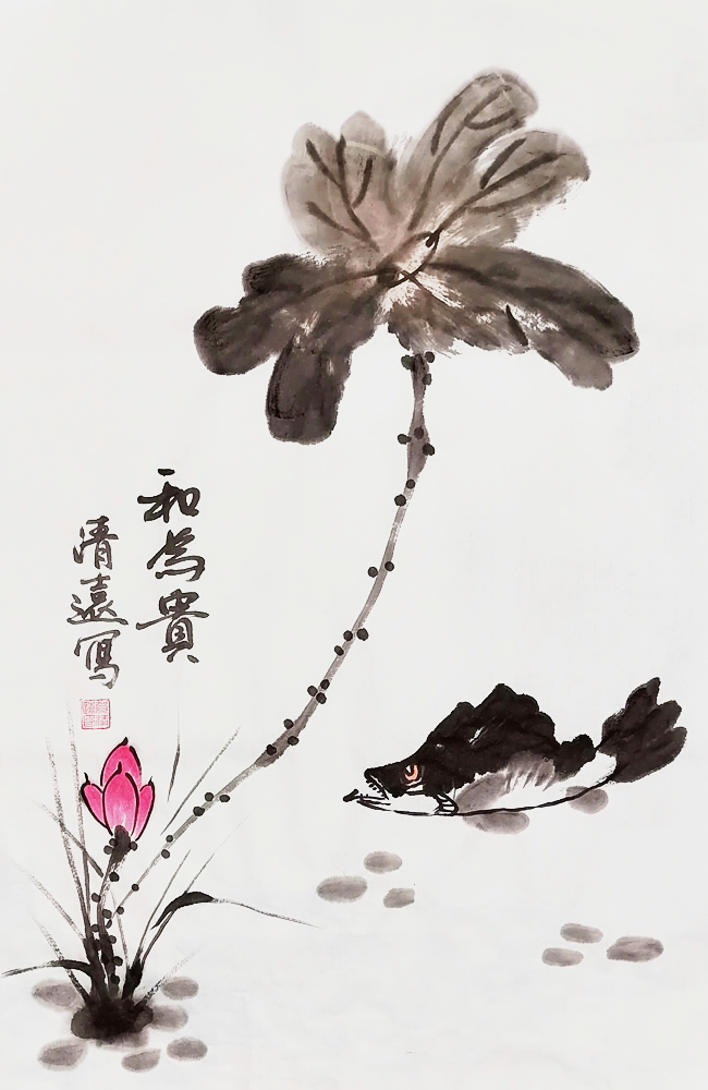 国画作品《和为贵》四尺三开,竖幅,横向尺寸45cm,纵向尺寸68cm,约2.75平尺,作品创作于甲辰(2024)年,现存装裱形态为软片未裱,是山东省明湖书画艺术中心理事贺清远创作的国画花鸟作品。