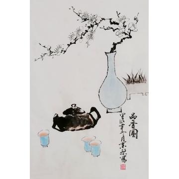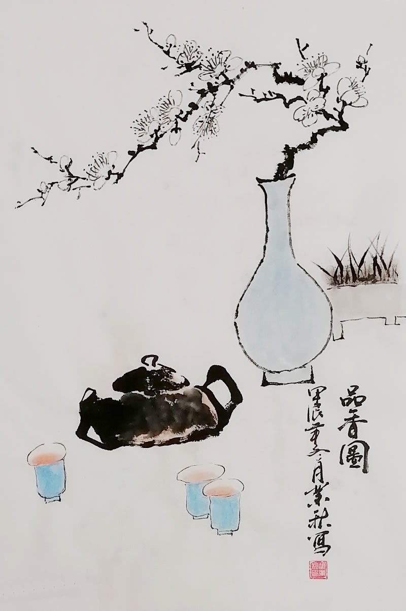 此幅《品香图》,45×68cm,画面中,素净的花瓶里插着几枝梅花,花朵姿态优雅,墨香与梅香仿佛都要溢出画来。 一旁古朴的茶壶,搭配几只蓝边茶杯,杯中似有热气升腾,好似正邀请人共品香茗。“品香图”,光是这名字,就透着闲适与雅致。在忙碌的生活里,看到这样一幅画,仿佛能偷得片刻清闲。