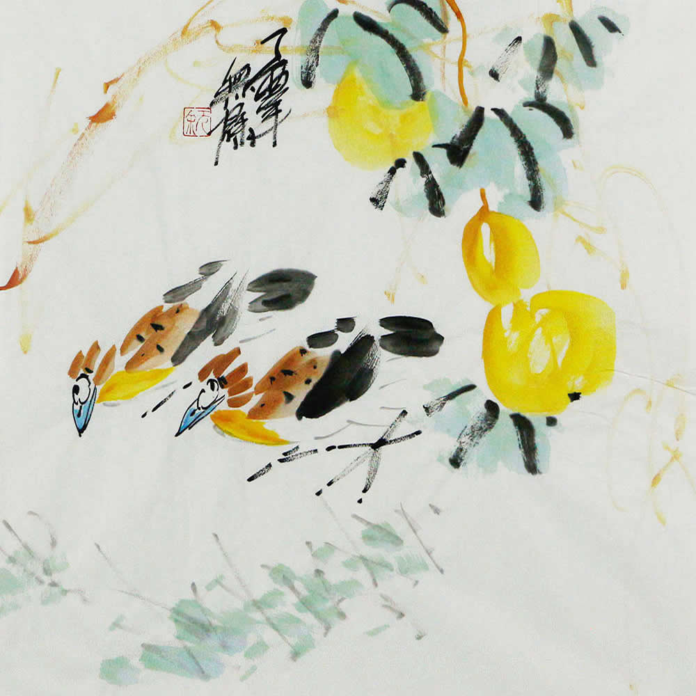 此幅《福禄双栖》,48×48cm,灵动的鸟儿羽毛色彩丰富,棕黑相间还带着一抹亮眼的黄,蓝色的喙显得格外俏皮 。它们仿佛在相互交流,姿态轻盈。旁边圆润饱满的黄色葫芦,在墨绿叶片的衬托下,生机勃勃。