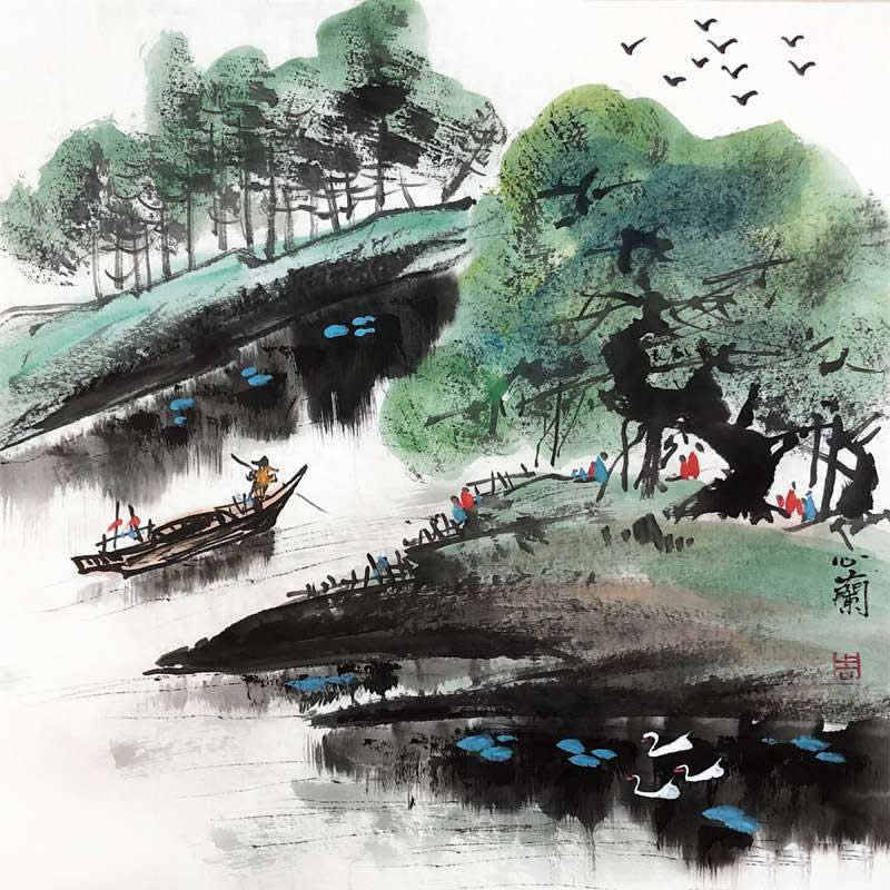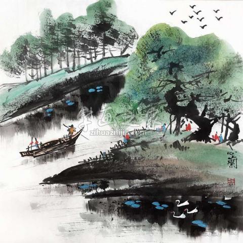 只取名家精品,六大品牌服务保障 《春江泛舟》周心兰国画作品